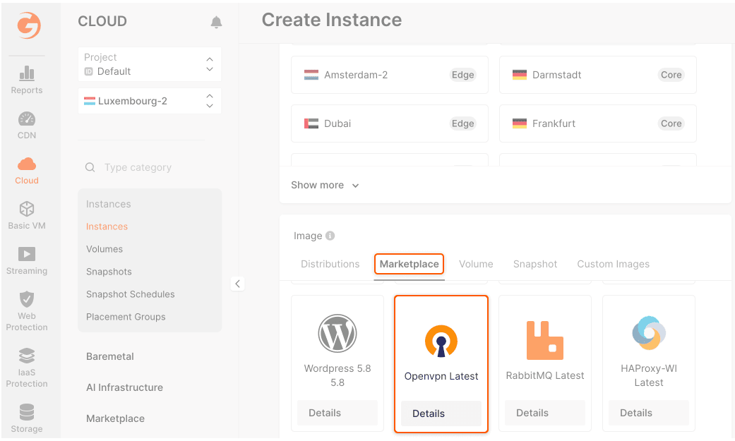 - In the Image section, select Marketplace. Click the Openvpn Latest image.